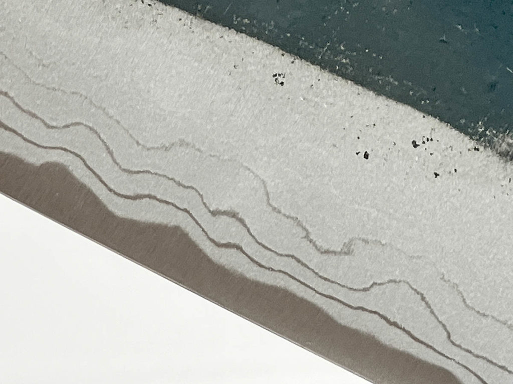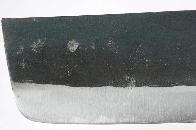 鉄の包丁はサビやすい性質がありますが、刃の上部に残る黒い部分は焼き入れの際に生じた酸化被膜。この黒打を残すことでサビにくくなっています。