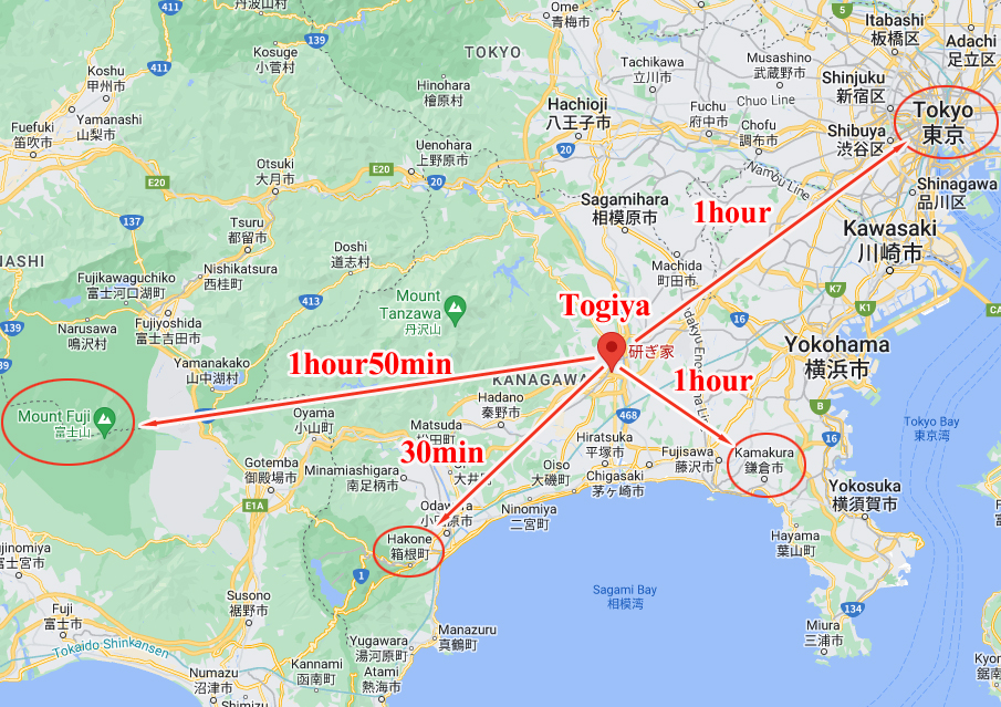 Our shop is located in Atsugi City, near the center of Kanagawa Prefecture, adjacent to Tokyo.It takes about one hour by car from central Tokyo and 40 minutes by train from Shinjuku.Additionally, Atsugi is close to popular sightseeing spots such as Hakone and Kamakura and offers convenient access to Mt. Fuji.